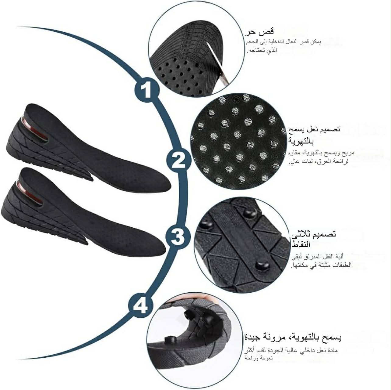 تحكم كامل في طولك بفضل نظام الطبقات القابل للفصل (3 سم، 5 سم، أو 7.5 سم) حسب نوع الحذاء.